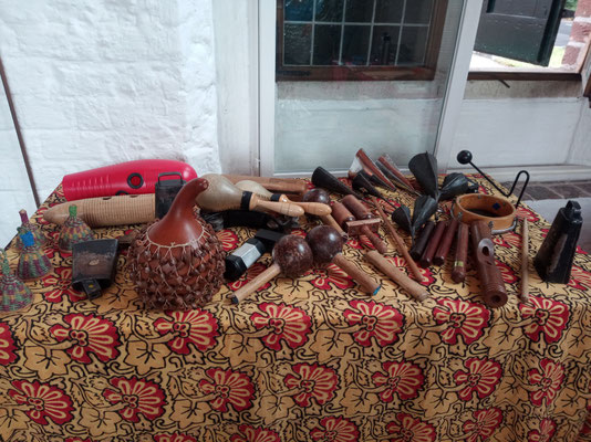 afrikanischer Rhythmusensembles auf Djemben, Basstrommel, kleinen Rhythmusinstrumenten, abgerundet mit einfachen bewegungsbasierten Rhythmusübungen, Tanzschritten, Liedern und abends zum Ausklang